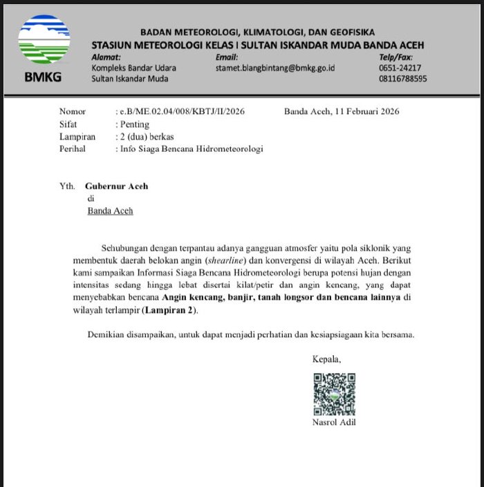 Peringatan itu tertuang dalam surat resmi bernomor e.B/ME.02.04/008/KBTJ/II/2026 yang diterbitkan pada Februari 2026. Dalam surat tersebut dijelaskan adanya gangguan atmosfer berupa pola siklonik yang memicu terbentuknya daerah belokan angin (shearline) dan konvergensi di wilayah Aceh.